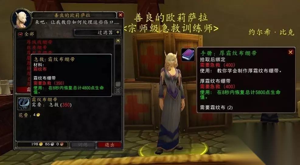 当然也可以前往达拉然,在魔法商业区的急你所急房间内找“善良的欧莉萨拉”,将急救专业提升至450点上限。
