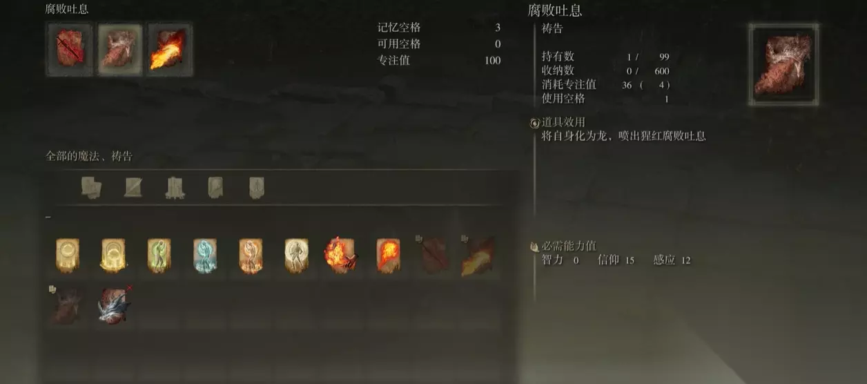 然后就是魔法祷告一类,拿腐败吐息举例。它的信仰需求是十五,感应是十二。所以和前面的猎犬长牙一样,只有满足这两项属性的最低需求,才可以使用腐败吐息。而且单看这个祷告,再提升信仰,它的伤害是不会提升的。