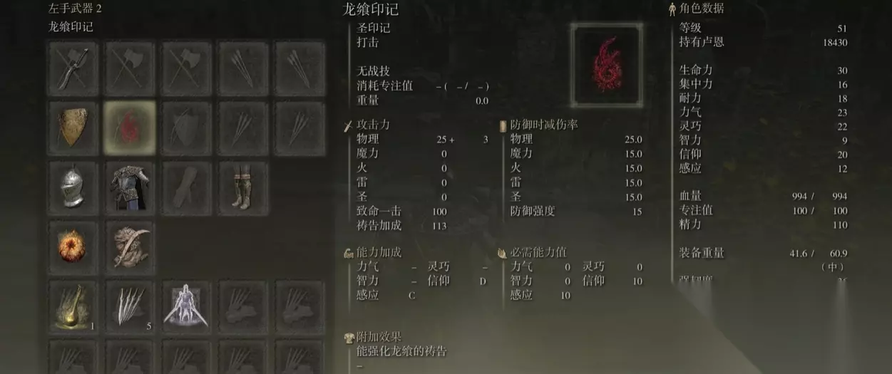 后续要想提高祷告的输出,则要提高对应印记的等级。龙飨印记的感应是C。如果提高感应值或者信仰值,对应的祷告伤害就会提升,而且它的加成和等级有关。如果升到十级,它的感应加成是S,而且还可以看它的附加效果。所以新手在初期一定要先把血量加到二十,然后再加点力气和灵巧。后续根据自身情况,加点智力或者信仰,从而使用强力的法术。