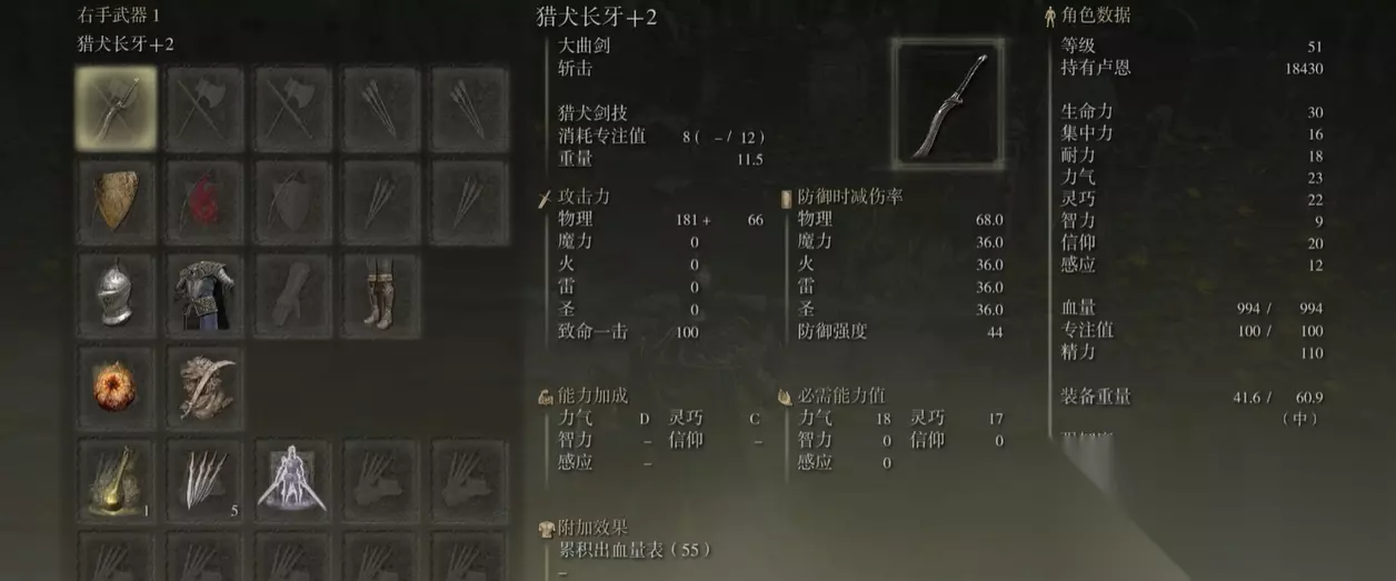 拿前期最常用的猎犬长牙举例,它的力气需求是十八,灵巧需求是十七。所以想要使用猎犬长牙,灵巧至少要点到十七。而力气则要升到十八,这是拿起武器最基础的前提。用所有武器的时候,都需要先看它的必须能力值,根据这样来进行加点。然后就是能力加成,力气加成是D,灵巧是C。那提升力气和灵巧都可以提升武器的伤害,而且灵巧对武器的影响比力气的影响更大。