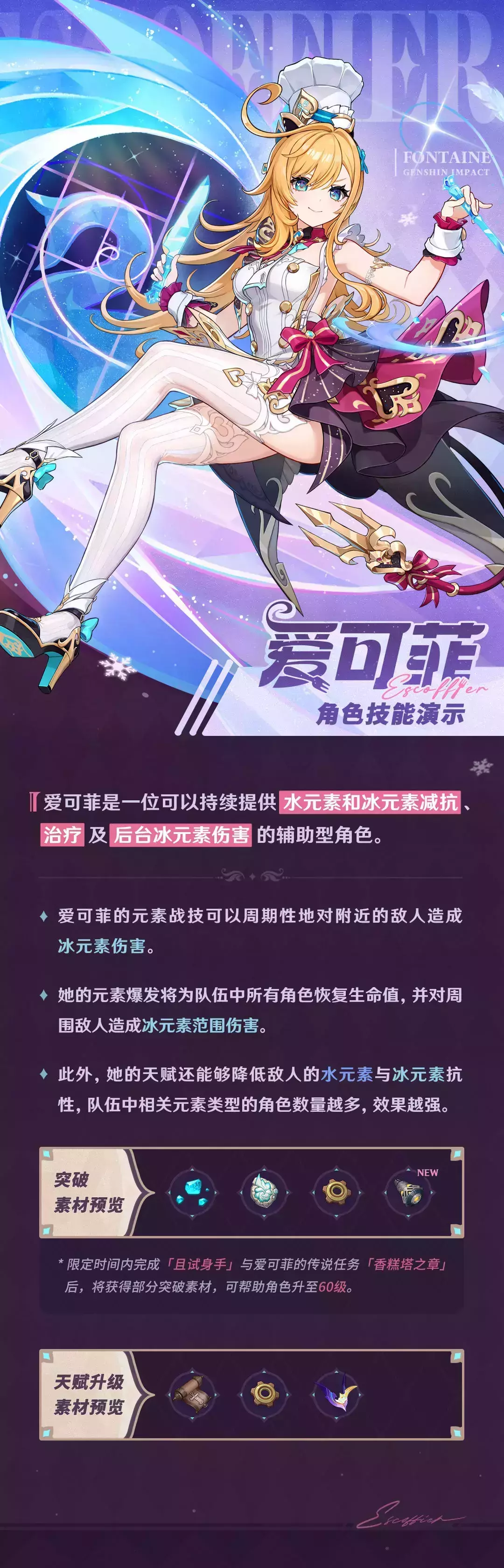 手持特制厨具的金发少女在料理台前站定,冰元素神之眼在厨师帽上泛着冷光...这位被娜维娅称为「能将郊游变作美食之旅」的枫丹「甜点大校」爱可菲,今日为我们敞开了她的私人厨房!