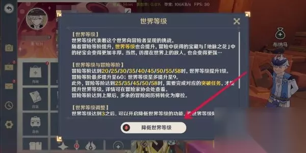 点击左上角的派蒙图标就会弹出菜单,在菜单页面我们点击世界等级后方的感叹号,在弹出的窗口中点击【降低世界等级】即可降低我们的大世界等级。