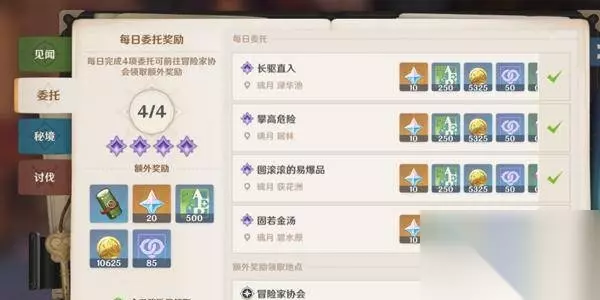 1、每日委托 每日委托可以快速提示世界等级。游戏中每天都有四个委托可以完成,完成委托可以获得大量的冒险阅历,并且完成四个委托后还有额外的原石奖励。