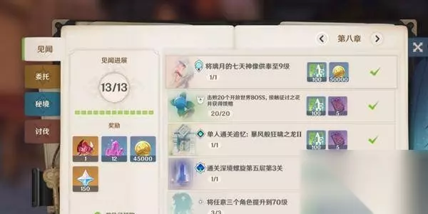 2、任务奖励 在见闻界面中可以看到许多个任务,每完成一个见闻任务后都可以获得冒险阅历从而提升大世界等级。