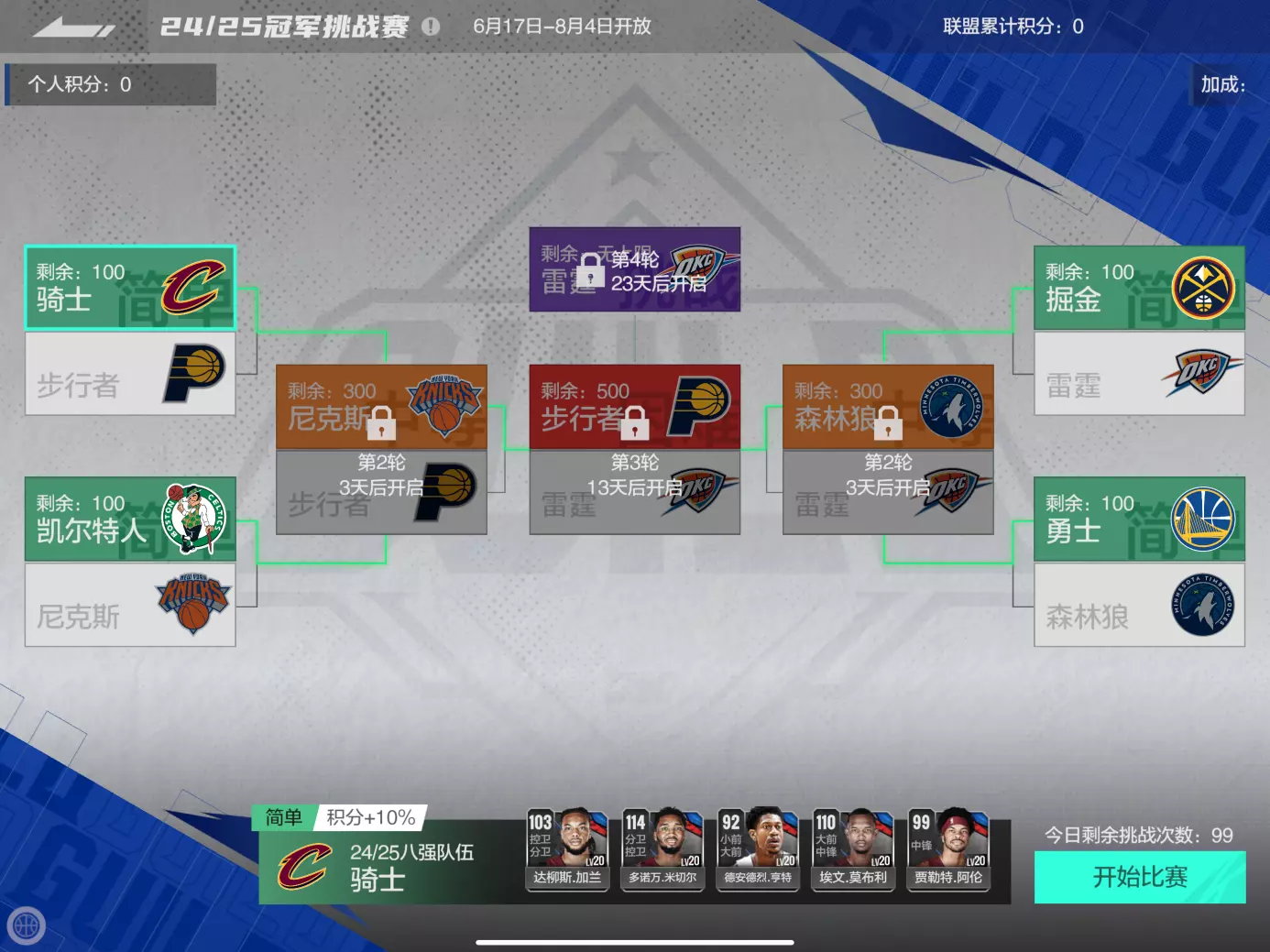 此外,加入联盟的玩家,还可以与盟友一起重现经典赛事!梦幻挑战赛将在6月30日开启,主题为24/25季后赛挑战,快来试试吧!