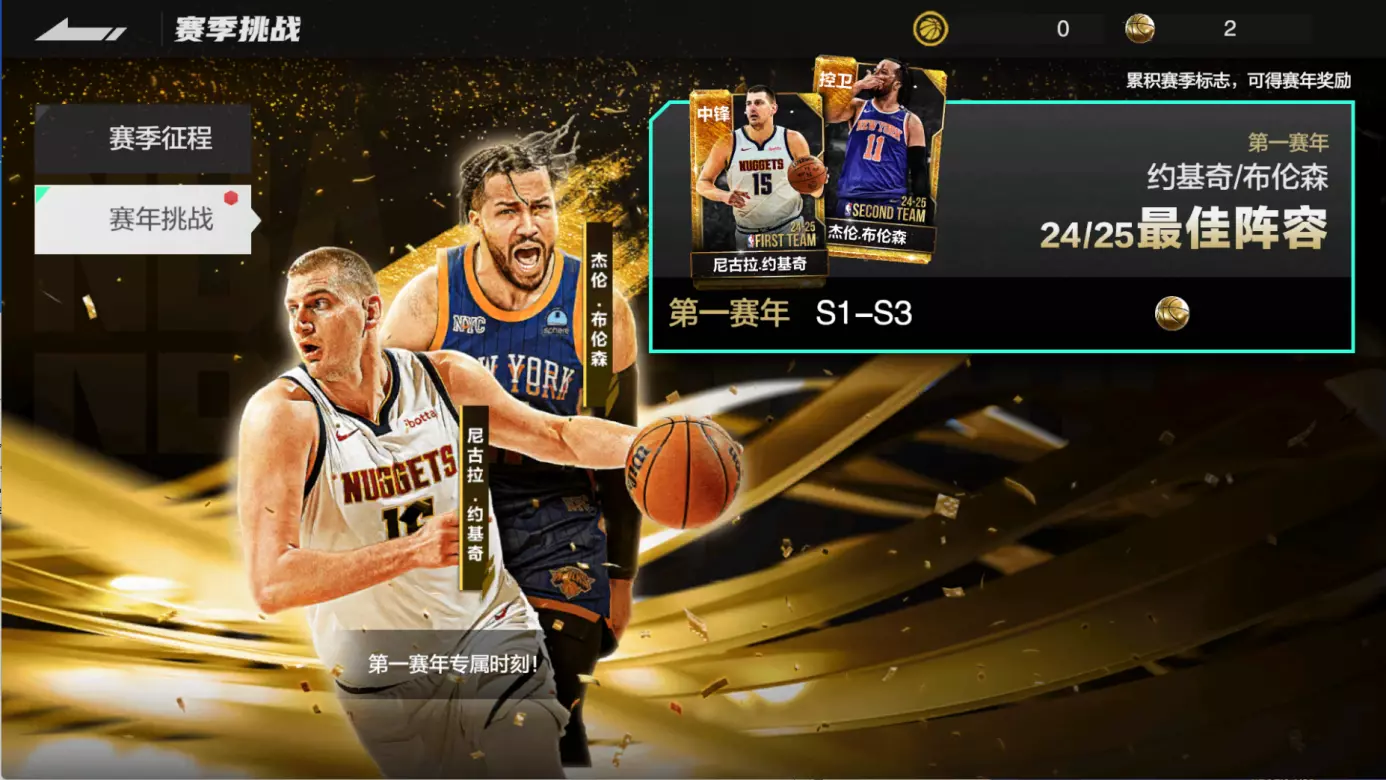 此外我们还将开启赛年挑战!在第一赛年中,我们为玩家准备了尼古拉·约基奇和杰伦·布伦森的时刻“24/25最佳阵容,每个赛季玩家可获得一个1个赛季标志。