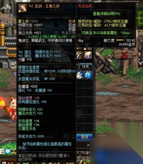 听朋友的建议,剑宗走四属性攻击,这样搞真的伤害比较高吗?进图的时候,魔剑降临选着暗属性攻击,这就能达到四属性攻击,剑宗这样提升大吗? 武器是王者圣剑,强化12,圣剑满属性的情况下,能有100的所有属性强化,而这把圣剑没有满属性,只有99的所有属性强化。圣剑上附魔的是物攻20,魔攻20,火属性攻击的宝珠,这就把圣剑打上火属性攻击的烙印。