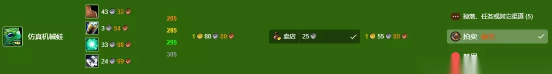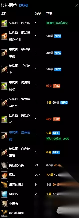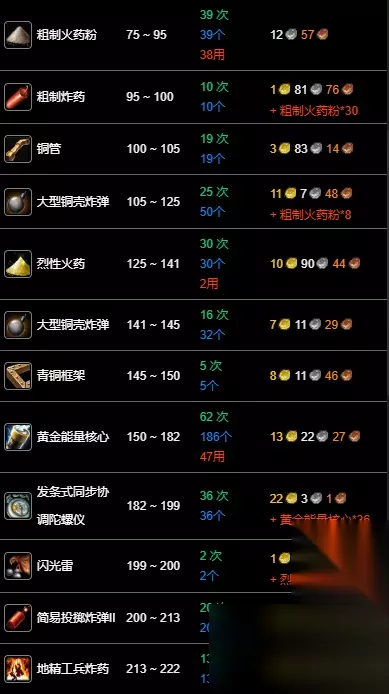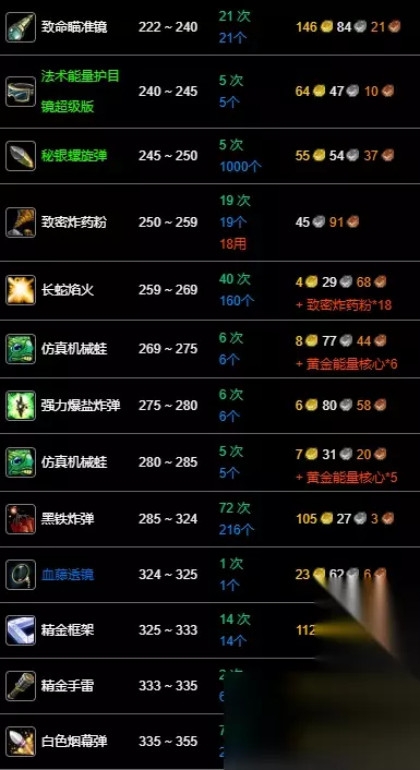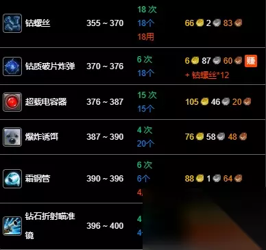 数据以一区 无畏 联盟为例,其他区服请参考:WLK专业技能冲级宝典 魔兽世界wlk工程1-400最省材料攻略的全部内容就介绍到这里,更多魔兽世界相关攻略正在添加中,敬请期待!