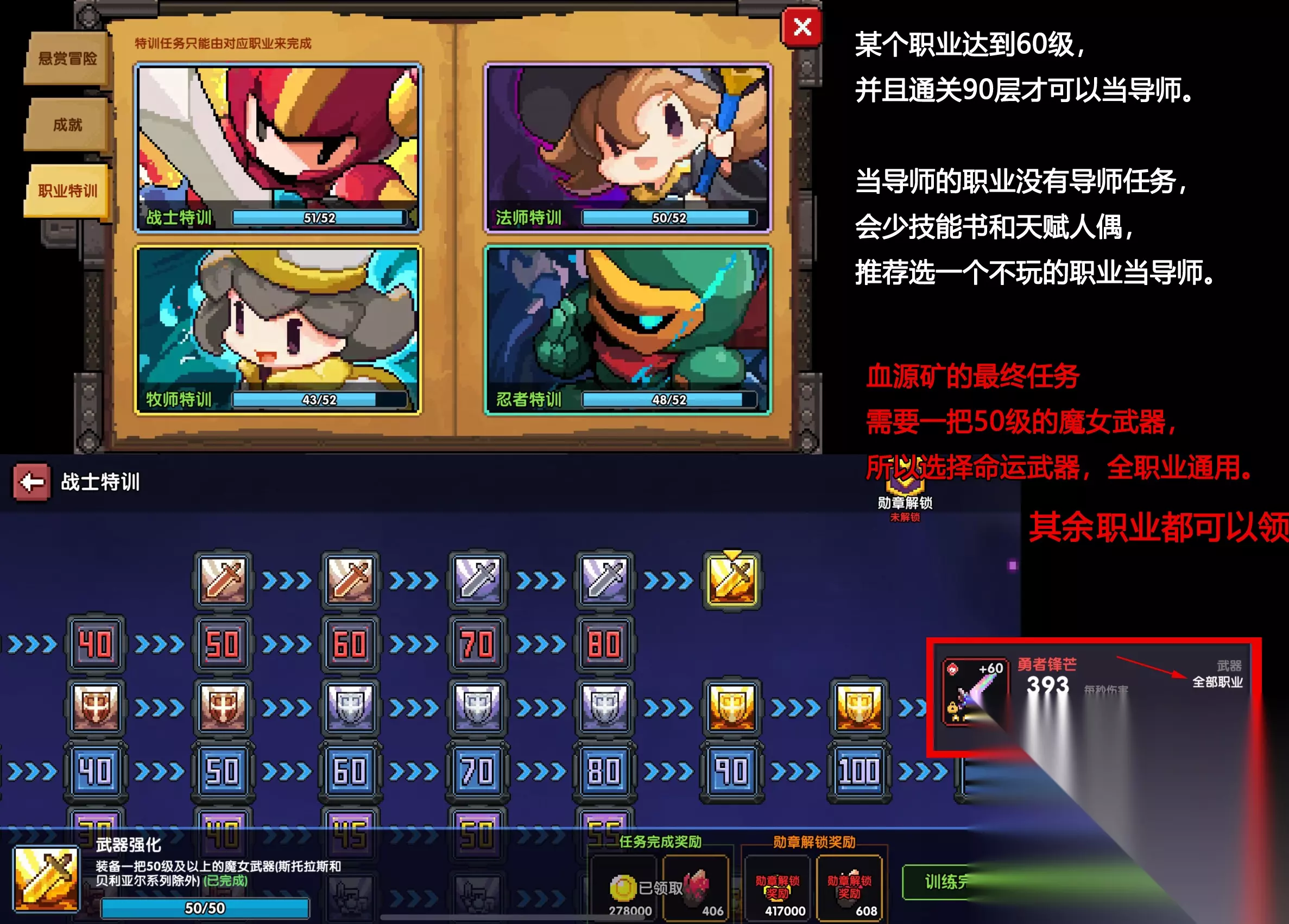 我的勇者【略长】对新入坑零氪小氪玩家的一些职业流派建议,狼忍鬼忍都别玩!!!如下: 续篇传送门: 看到好多人问狼忍厉害还是鬼忍厉害呀,我该玩什么职业?首先要明白,再强的职业没有基础都弱,大佬随手一转就能拉开你几百条街,新人该选些前期要求不高,对自己发展有帮助的流派,不要盲目追求版本之子。 针对以上问题,先要了解青蛙版本切换的有多快,作为一个刚入坑3个月的玩家,抽完晶轮出新火,抽完新火出天宫,抽完天宫出新木,抽完新木又要出天宫上位新限定,都是套路! 重点!!!:入坑玩的第一个职业,必须是自己不喜欢的!(60级开放导师,具体看图。) 必须加一个活跃公会才能快速提升!!!(大佬越多越爽喔)