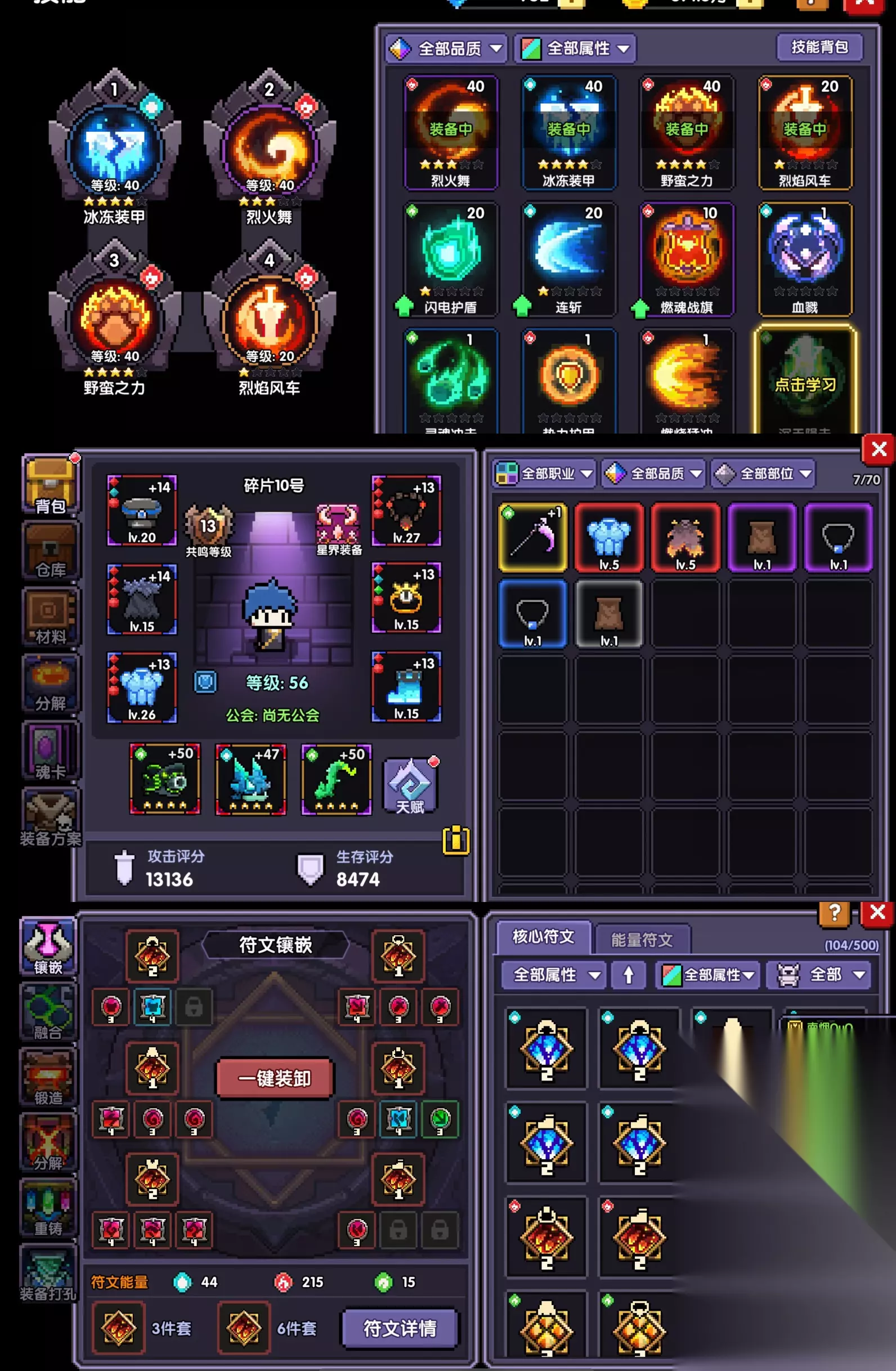 拿【战士】举个栗子,推荐刚入坑新人别乱抽!别 乱抽!别乱抽!先靠技巧试炼拿烈焰风车(对红武要求不高,拿不到也没关系,靠祭坛多凹一下85层)。 武器选传说武器(橙色)强化到4星,随便强化多少件都可以(四星即可,都是狗粮,以后喂给红武。),有红孔装备就换,最好是四孔,随便造一组符文核心(灰烬的正义),靠祭坛打穿85层,只要不手残就没什么问题。