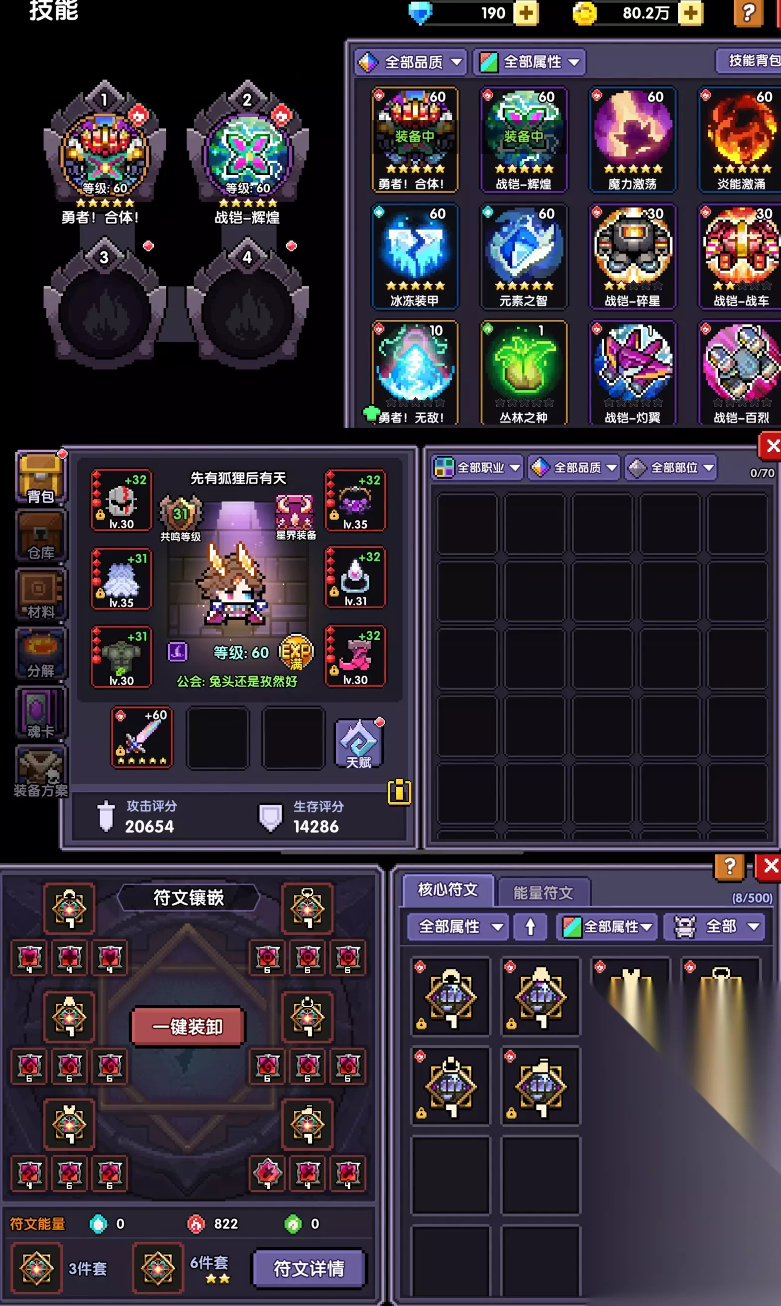 85层后攒的武器币技能币全部砸进命运系列-【勇者锋芒】,再到商店或者技能书卷里抽【勇者合体】和【辉煌】,符文换成智慧核心套,好处是全职业通用,可以快速完成导师任务。 商店买的话各一本就够,只要有公会这点钻石不会缺。