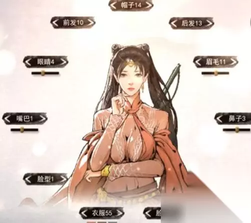【数据:女】 1号:脸型、嘴巴 3号:鼻子、后背 4号:眼睛 10号:前发 11号:眉毛 13号:后发 14号:帽子 30号:脸饰 55号:衣服
