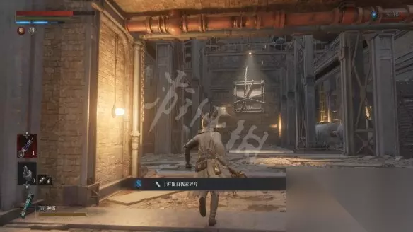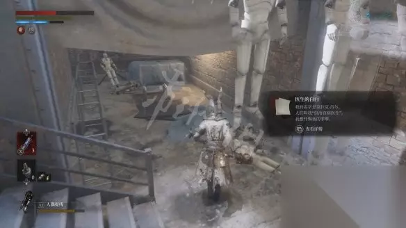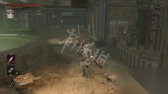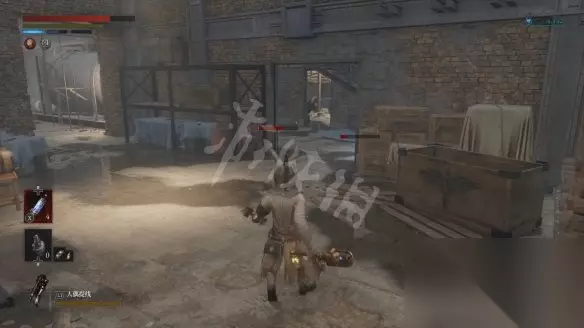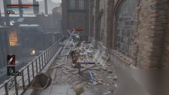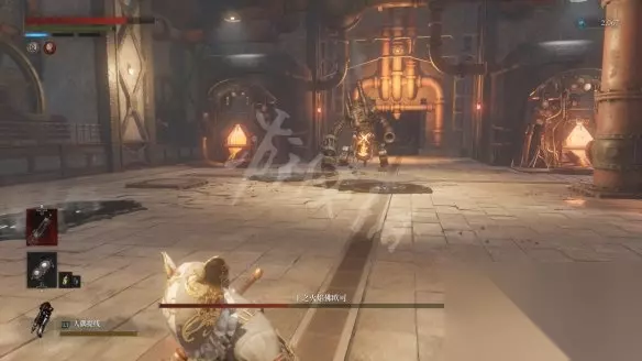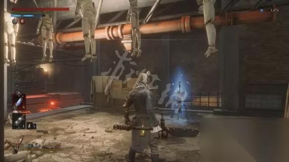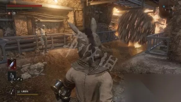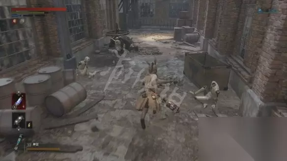 回到二层平台直走,沿着路走到头会看到两个人偶,其中远处投弹兵面前的木板走过去会塌掉,掉下去以后要面对一群人偶的围攻。注意白色人偶伤害高且很难打出硬直,注意不要贪刀。