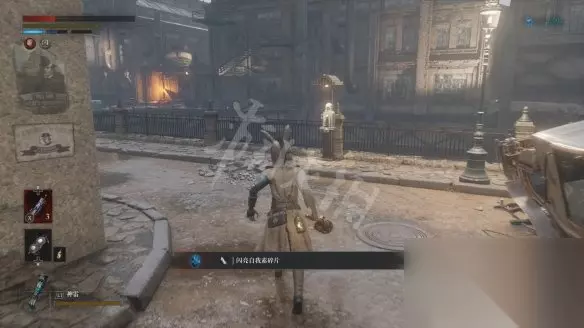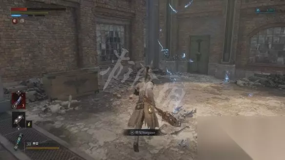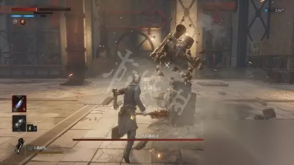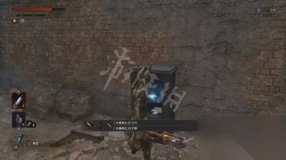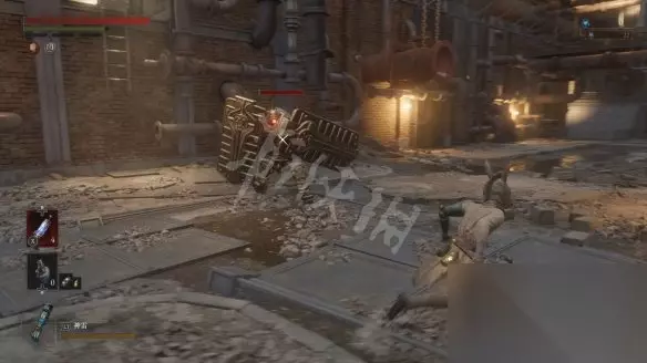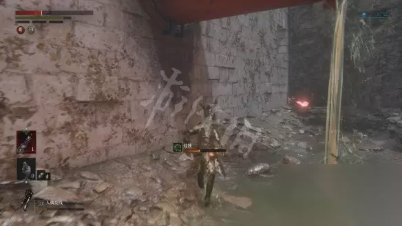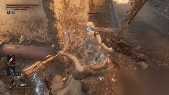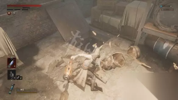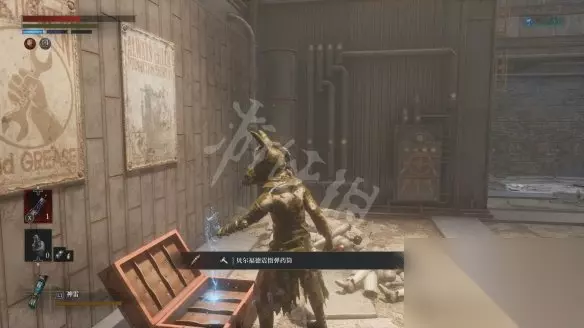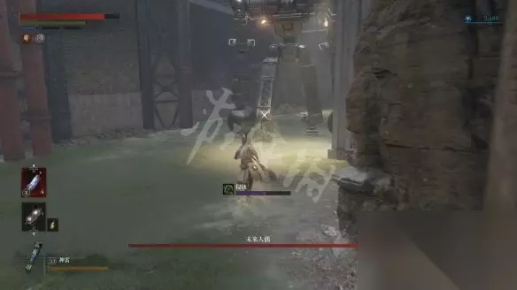 从大坑跳下去会遇到一个盾兵,正面打会比较吃力,可以尽量拉扯一下,等对方先出手然后绕到它侧面蹭刀。击败盾兵后会获得用于升级军团义手的材料【军团口径】。