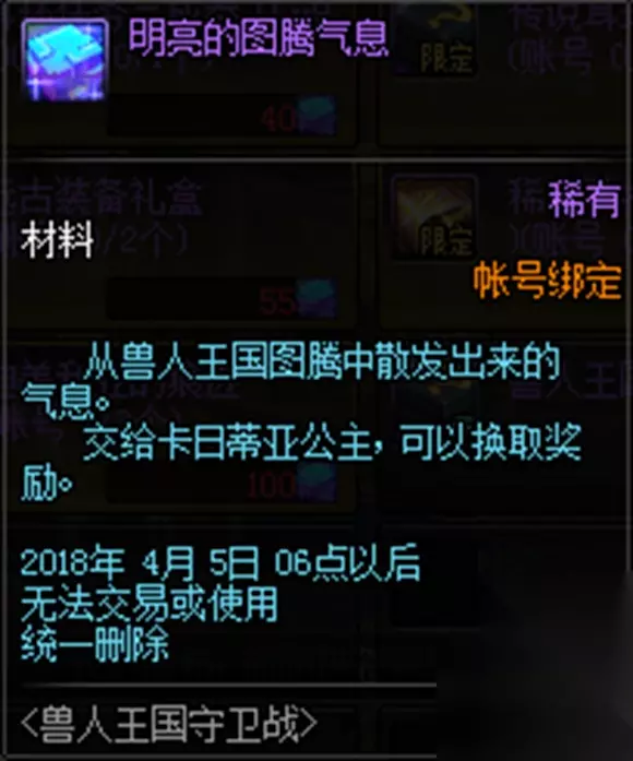 (每次通关完地下城后,领主随机掉落4-5个活动材料[明亮的图腾气息]) 活动材料[明亮的图腾气息]: