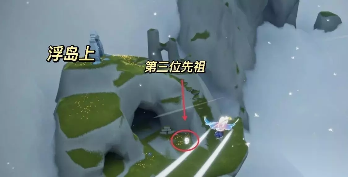 4、第四位先祖位置,在最左边的岛屿边缘,这位先祖是活跃领航员,动作是展示,收集方式为追随光影。
