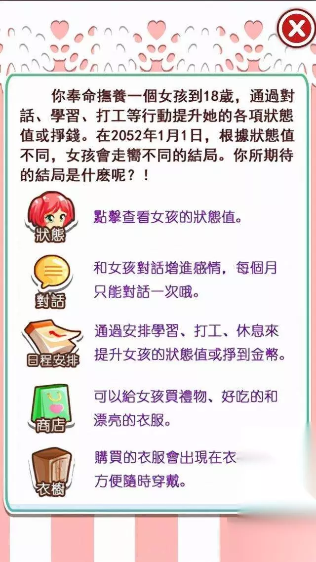 爱养成是一款非常好玩的萝莉养成换装手游,游戏玩法简单,易于上手,并且游戏出场人物众多,个性鲜明,每一个都是鲜活的人物角色。除此之外,游戏场景丰富多样,若干个故事穿插,35种结局等你发现,让你感受更加真实饱满的游戏剧情。爱养成的游戏任务很明确:将一个12岁的小萝莉抚养到18岁,你需要和这个小女孩一起成长,一起在游戏中生活,通过对话,学习、打工等方式提升她的各项状态值。如同其他类型的萝莉养成游戏一样,萝莉会根据你的选择,最终走向不同的结局,最后是被你培养成一个女神还是一个女屌丝,就看你的选择了。
