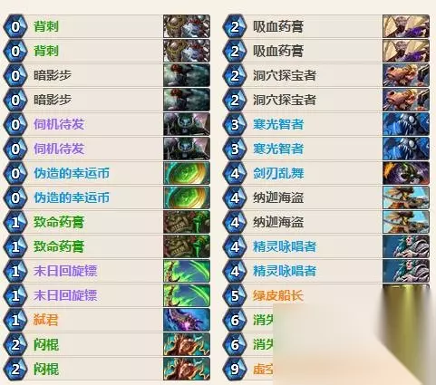 低优先级(只有特定情况才留) 致命药膏和吸血药膏——与弑君能配合的卡,但没有弑君的时候就基本没用。 对阵慢速卡组:高优先级(每次都要留)弑君或洞穴探宝者——就像上面说的一样,因为弑君是卡组的关键,你要尽可能快地抽到它。精灵咏唱者——如果你过不到弑君,这是另一种方式。如果你过到了,它能给你更多的buff或过牌组件。寒光智者——这就是“爆牌”的由来。对阵慢速卡组时,寒光智者是很棒的。你不仅能爆对手的牌,也能使你过到所需要的牌。