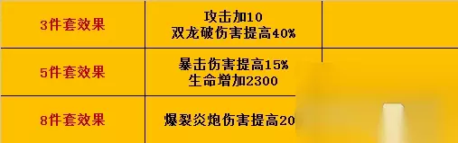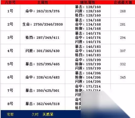 合成牌: 建议用【蓝色合成牌】或【橙色合成牌】,蓝色价格便宜,出最大值的几率还可以。资金‘特别充足’的可以用【橙色巨匠牌子】必出最大。 综合上述从属性来看【极限幻象八卦牌】套装属性火系技能伤害加成很高,兑换方法也不是特别繁琐,适合PVE火系气功搭配,入门级玩家首选。完成当前版本除顶级24副本之外,所有副本伤害足够了。