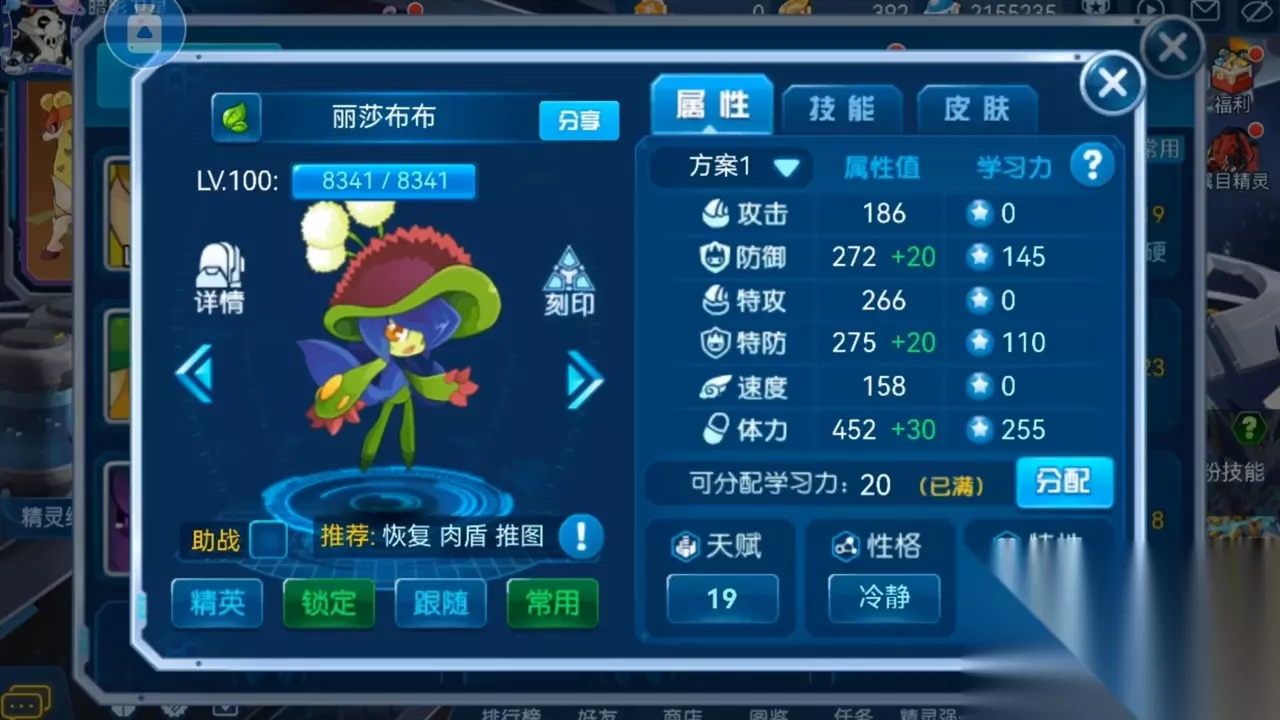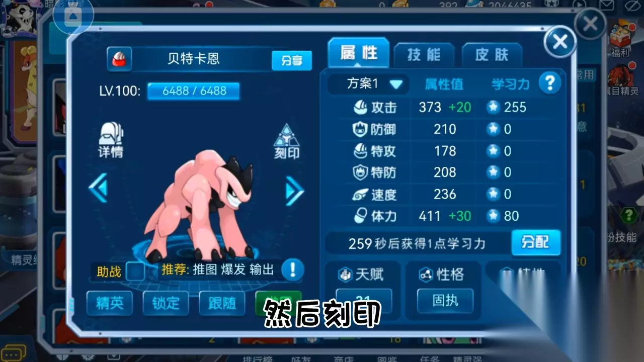 ·刻印选择就是攻击速度、体力,附魔可以给一手灼痛。 ·然后是丽莎布布,丽莎布布的学习力分配,推荐体力拉满,双防各一半,这样打盖亚跟卡修斯的时候不至于被对面几举打死。性格首先推荐保守,如果刷不出保守小伙伴,冷静也可以凑合着用。特性推荐坚硬。刻印选择是物防、特防还有体力,反正就是把丽莎布布搞的贼肉血贼多就行了,附魔可以选择抑制或者绝壁。