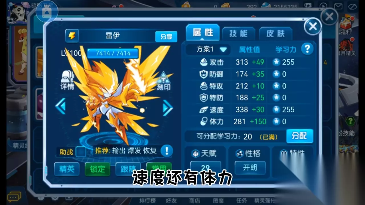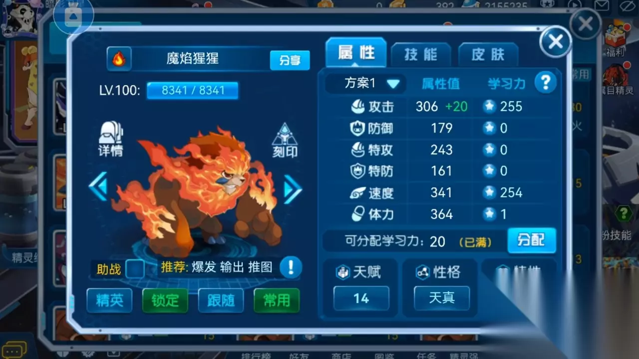 ·接着是魔焰捏捏,猩猩的速度种族值很快达到了114,超越了启航大部分的精灵,所以不能浪费了速度种族值,学习力直接攻击速度拉满。这里不知道当时发了什么神经,去给体力点了一点学习力,这里不用理,直接攻速拉满就行了。性格先选择开朗,我这里的天真是因为懒得洗了。特性可以选择精准或者炎4,回避好像也不错。