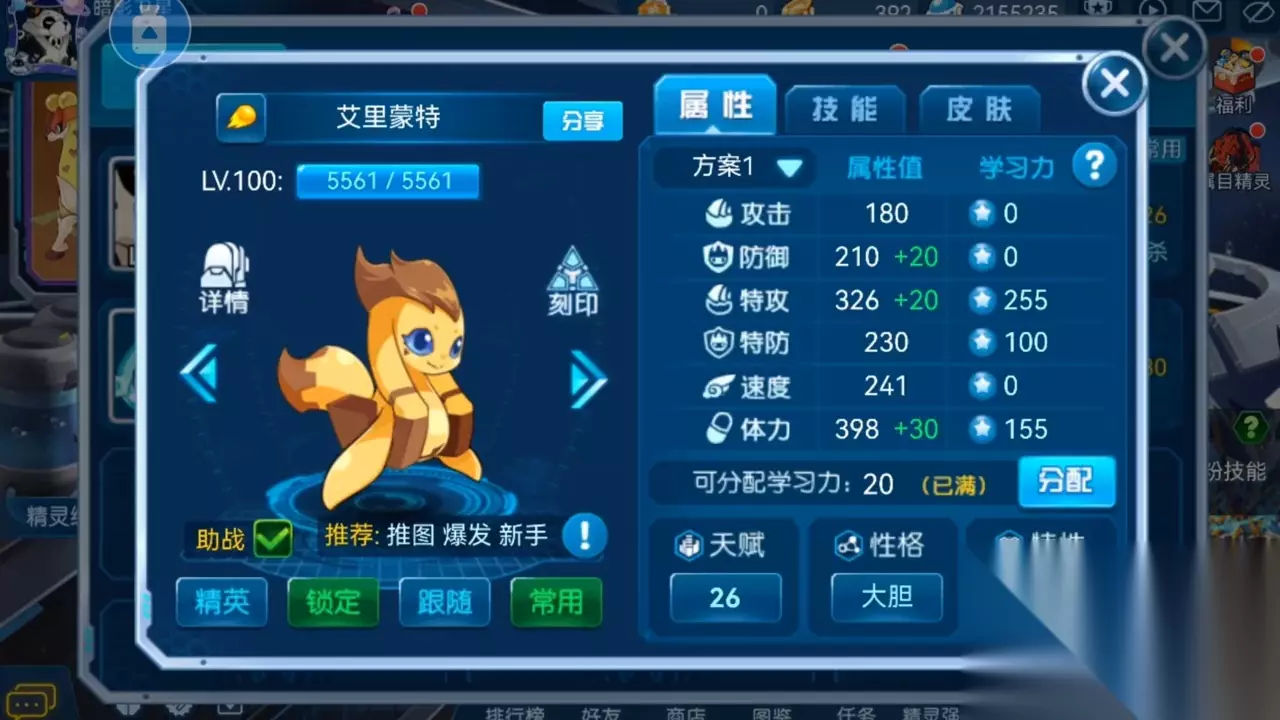·下一只精灵是光系平民神宠蒙多,蒙多的学习力刷志大家可以参考一下我这里或者如果你觉得麻烦,直接特攻体力拉满也行。性格推荐保守,我这里的大胆是为了把蒙多搞肉一点,这里大家不用学,我就直接选择保守就行了。 ·特性唯一推荐瞬杀,因为蒙多有一个先杀先死技能,配合一个瞬杀直接秒天秒地秒空气。至于蒙多了附魔就没有什么太大讲究了,也可以试一下抑制。