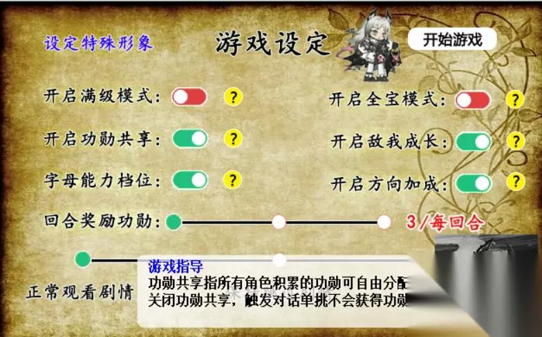游戏开始前,有个功勋共享,这个一定要开启,这也是这个版本的新功能,就是所有人物所获得的功勋都可以统一交给玩家分配,这样也不至于浪费功勋,每个将领都能得到培养。 如果想要获得更多的功勋,那么每回合奖励也可以调整一下,最低是3最高是5,建议调到5,这样过关奖励的功勋也多一些,方便将领快速成型。