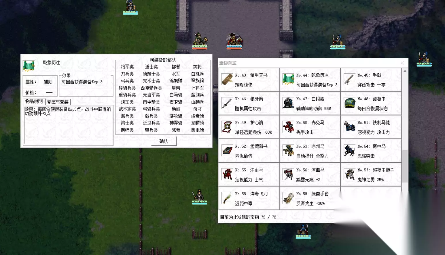 宝物加功勋的有三个,最好用的还是乾象历注,可以说能不能在关卡中获得更多的功勋,完全就看这件宝物了,一些特定的关卡给需要培养的将领装备上,那功勋涨起来真是太快了,比如襄武之战的张嶷,寿春之战的赵统,只要装备上乾象历注,那么这种特殊关卡少说也能获得几千功勋。乾象历注一定要给那种关卡挨打多或者攻击多的将领装备! 还有两件宝物加起来有套装属性,国士无双袍+伤寒杂病论,这至少要38关才能获得齐全,加上装备有局限性,所以不用过多的期望这两件装备。