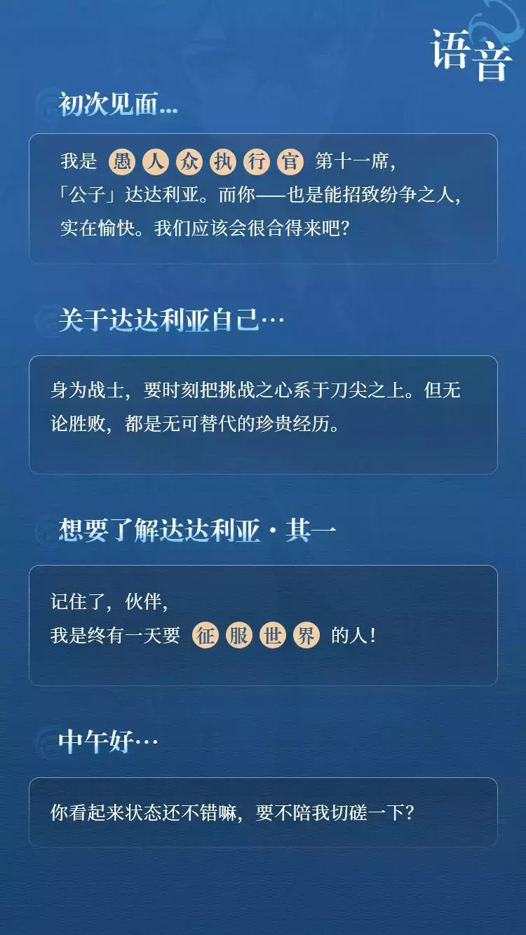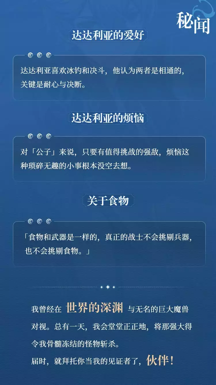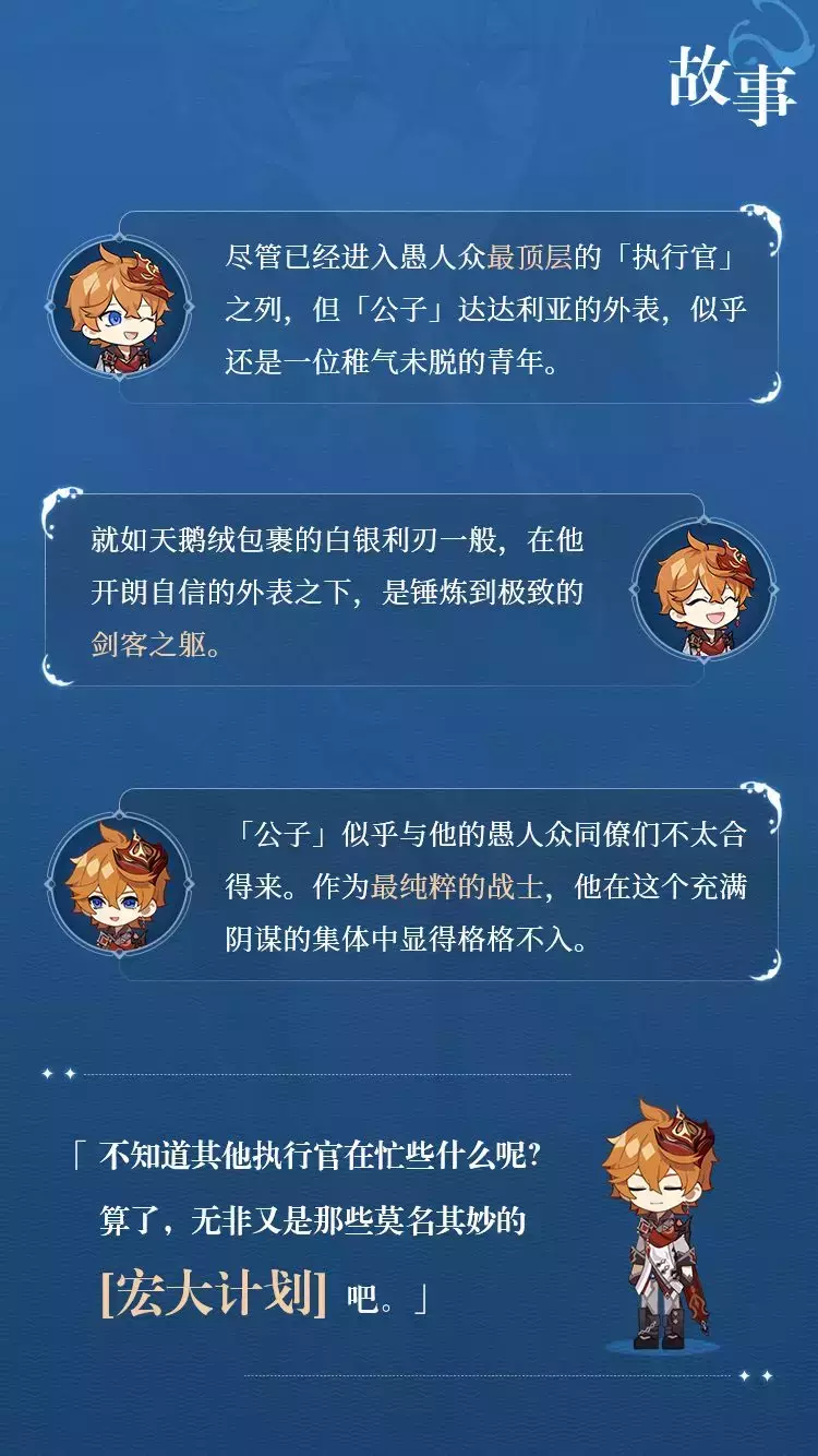 旅行者们好呀。今天带来了那位年轻的愚人众执行官「公子」——达达利亚的情报,一起来看看吧~
