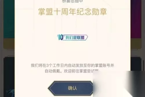 暗号奖励 1、掌盟10周年纪念勋章奖励,兑换成功后将在3个工作日捏成功发放到掌盟账号并自动佩戴。 2、金主buff附带奖励级10周年纪念徽章实物奖励,将在活动结束后75个工作内进行邮寄。 3、金铲铲之战神秘礼包,兑换成功后会随机开出一份道具奖励,需要在8月26日游戏上线后二次领取。 4、英雄联盟手游神秘礼包,成功兑换后会随机开出1分游戏到奖励,需要在游戏上线后回到页面进行二次领取。