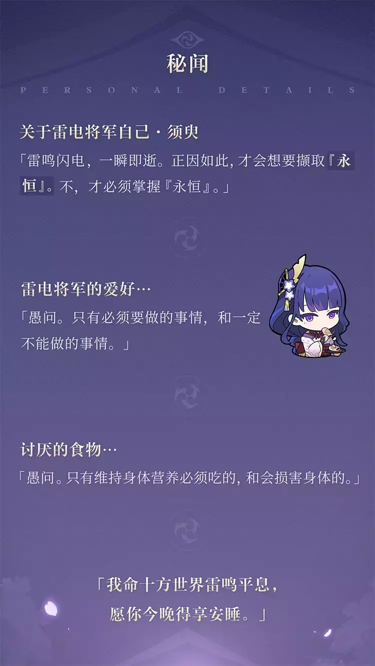 其身为御建鸣神主尊大御所大人,许稻妻人民以亘古不变之「永恒」。
