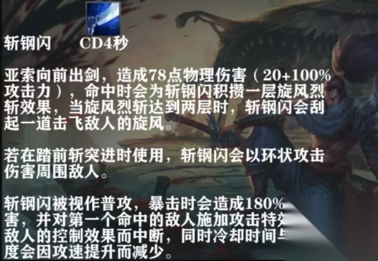 1技能斩钢闪是亚索的主要输出和控制技能,视觉效果是向前戳一下,距离不短,伤害也不低,命中敌人还会为亚索积累一层旋风烈斩,拥有两层旋风烈斩,也就是1技能连续命中敌人两次后,下一次斩钢闪将会刮起一道飓风,造成伤害的同时施加击飞效果。这个技能值得注意的有两点,一个是和3技能踏前斩同时使用会成环状造成范围伤害,另一个则是斩钢闪会被视作普攻,享受暴击加成和攻击特效,且CD与施放速度会随攻速反比变化,这意味着暴击和攻速是亚索最重要的两个属性!