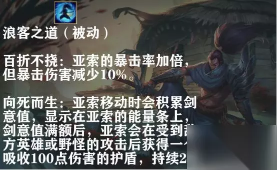亚索的被动技能浪人之道分为百折不挠和向死而生两个效果,一听名字就很高大上有木有?其中百折不挠的效果会以暴击伤害减少10%为代价将亚索的暴击率加倍,这个被动使得依赖暴击的亚索靠两件暴击装就可以达到满暴,输出拉满!而向死而生则会使亚索在移动时积累剑意值,满剑意值的亚索在受到攻击时会获得护盾,对线时注意好自己的剑意值,保证每次换血都有护盾,亚索就能在对线期立于不败之地!