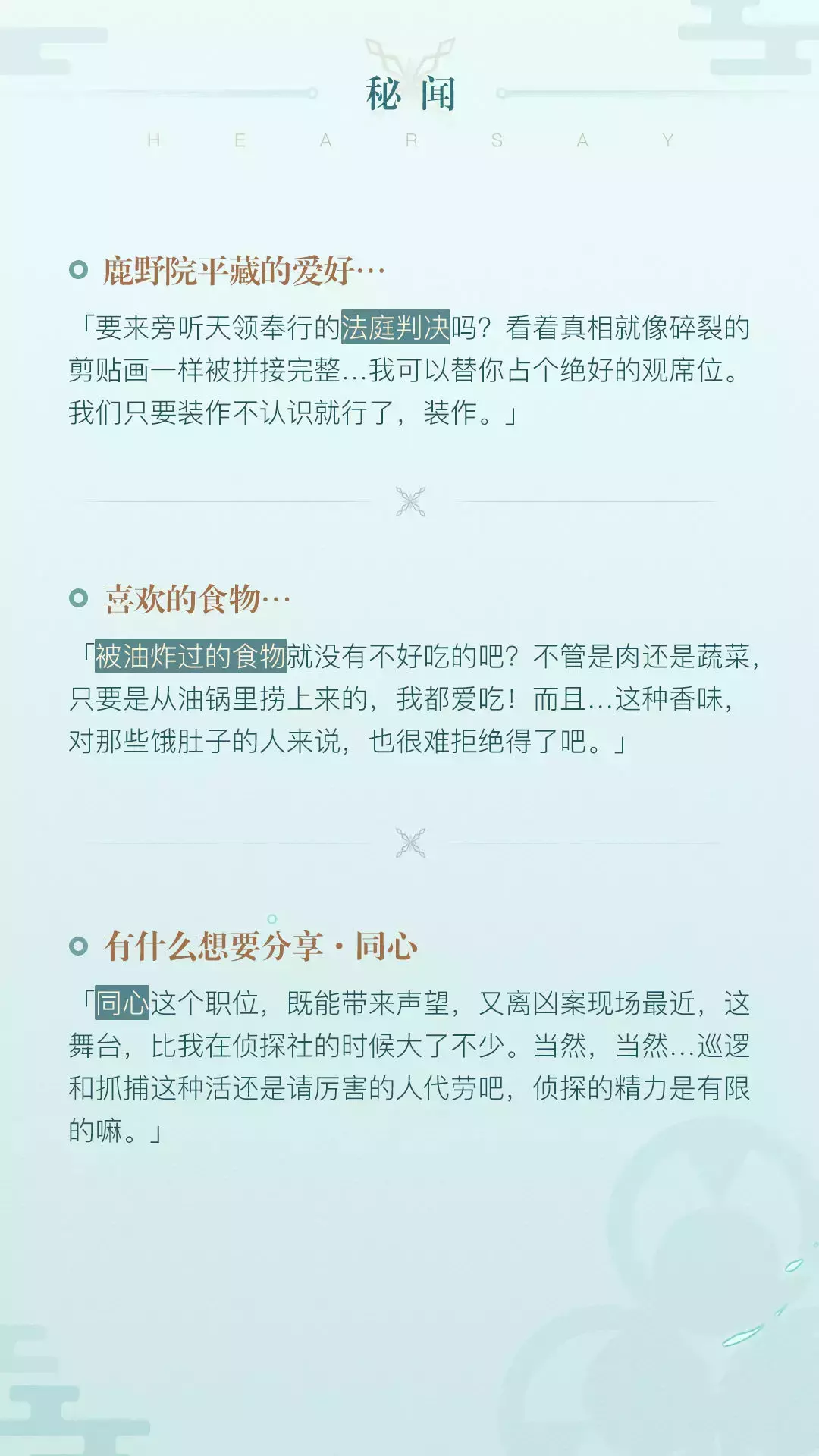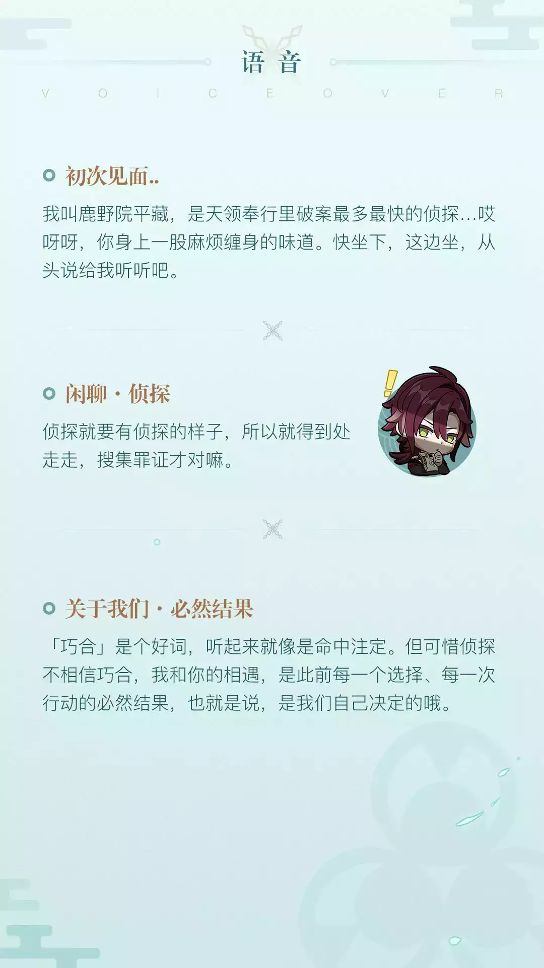 今天将为大家介绍的角色是鹿野院平藏,一个不凡的少年侦探。