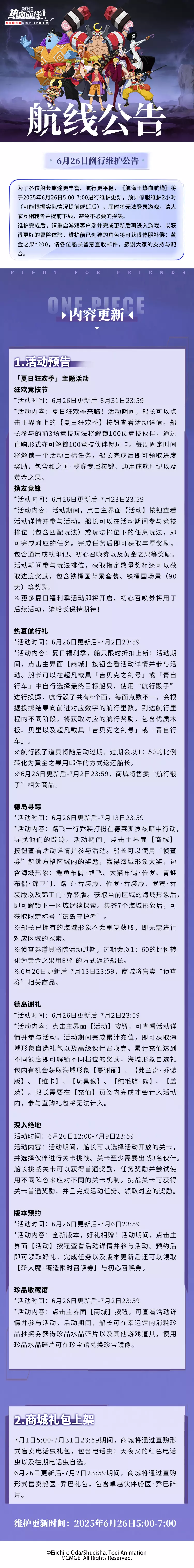 每周例行维护,夏日福利季开启,百位竞技伙伴免费游玩,还有和之国罗宾专属按键等你领取!全新超凡载具吉贝克之剑号限时上架,更有超多海域形象亟待解锁!