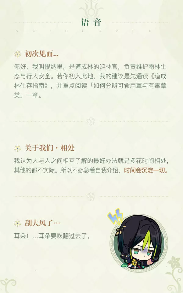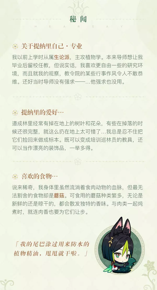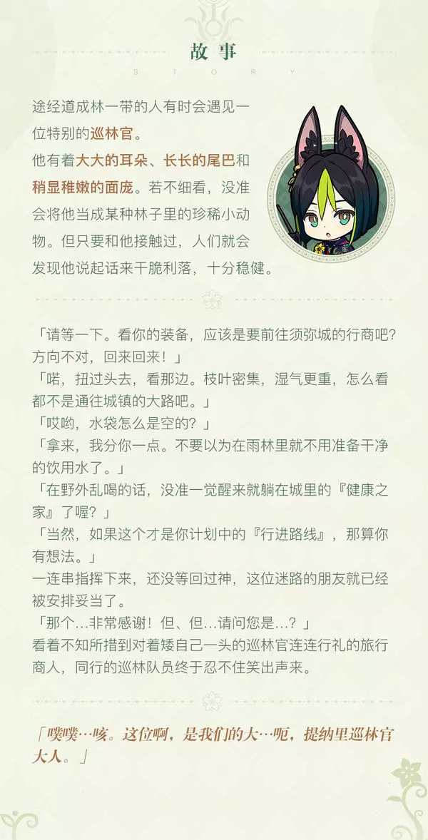 精通植物学的少年学者,现于道成林任巡林官一职。直率热忱,擅长教导脑瓜糊涂的人。