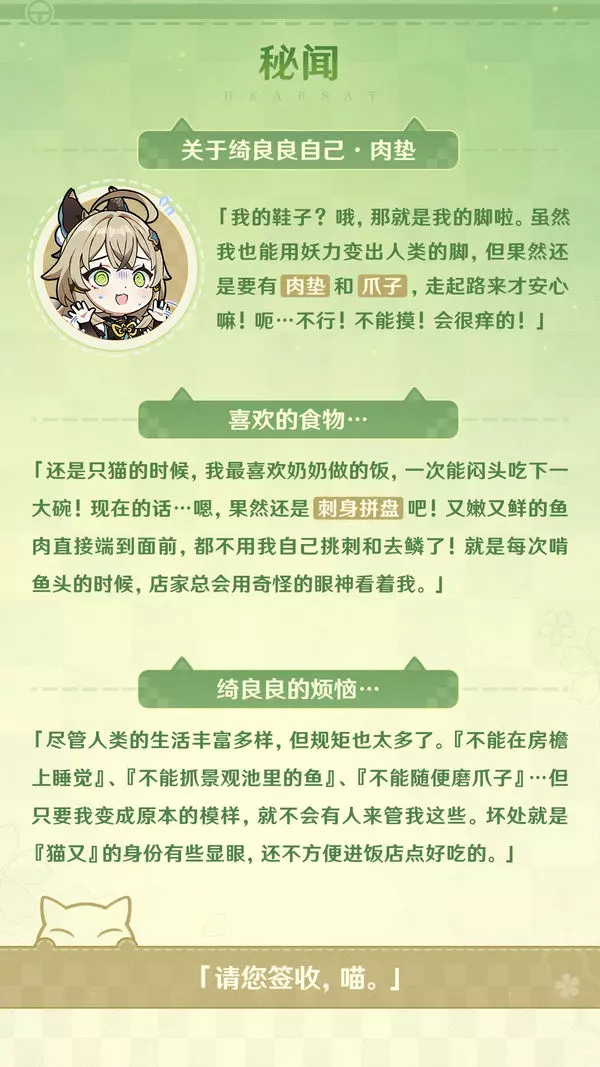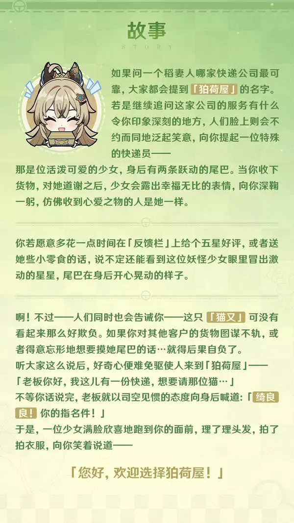 她是稻妻快递公司「狛荷屋」的送货员,一只热爱自己工作、向往人类社会的「猫又」。