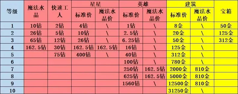 详细列表如下,建筑和英雄等级按照目前已开放的等级为准,即9级英雄道具和10级建筑,其中最后一级无法使用魔法水晶,另外区分价格单位,红色为钻石,黄色为金币: