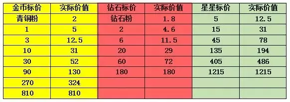 (5)星星:1-6级参考价格为(锚定标准为4级魔法水晶=5级星星)4钻,10钻,26钻,65钻,162.5钻,400钻,最终折合为3点星星≈1钻
