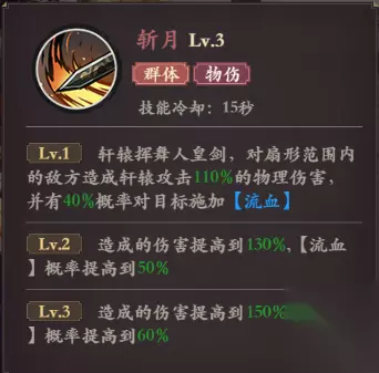 技能1· 斩月·主动AOE 技能描述:轩辕挥舞人皇剑,对扇形范围内的敌方造成轩辕攻击110%的物理伤害,并有40%概率对目标施加【流血】 省流版:扇形AOE物伤