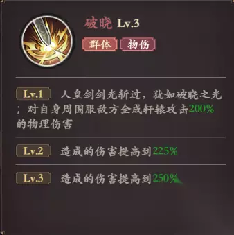 技能3· 破晓·主动AOE 技能描述:人皇剑剑光斩过,犹如破晓之光;对自身周围服敌方全成轩辕攻击200%的物理伤害 省流版:AOE物伤