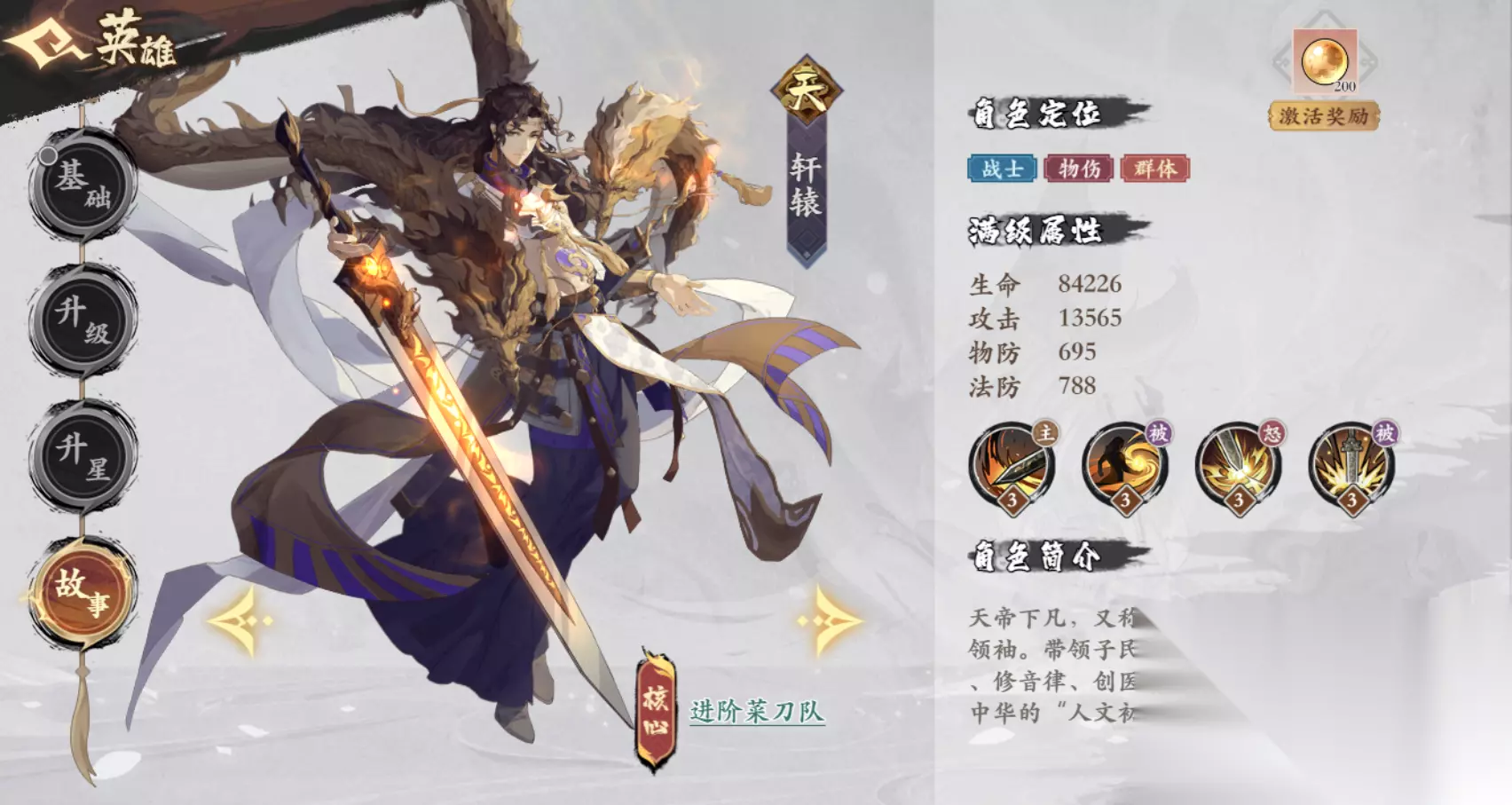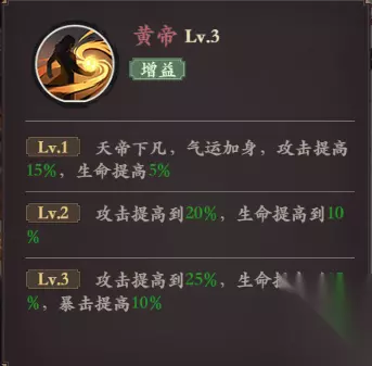 技能2· 黄帝·被动 技能描述:天帝下凡,气运加身,攻击提高15%,生命提高5% 省流版:加攻击,加血量