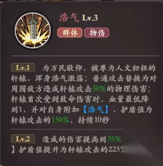 技能4· 浩气·主动AOE 技能描述:为万民敬仰,被尊为人文初祖的轩辕,浑身浩气激荡;普通攻击替换为对周围敌方造成轩辕攻击30%的物理伤害;轩辕首次受到致命伤害时,血量最低降到1,并对自身附加【浩气】,护盾值为轩辕攻击的150%,持续10秒 省流版:单攻变群攻,要被杀的时候,血量只会为1,再有个盾,当然伤害超过盾还是得死