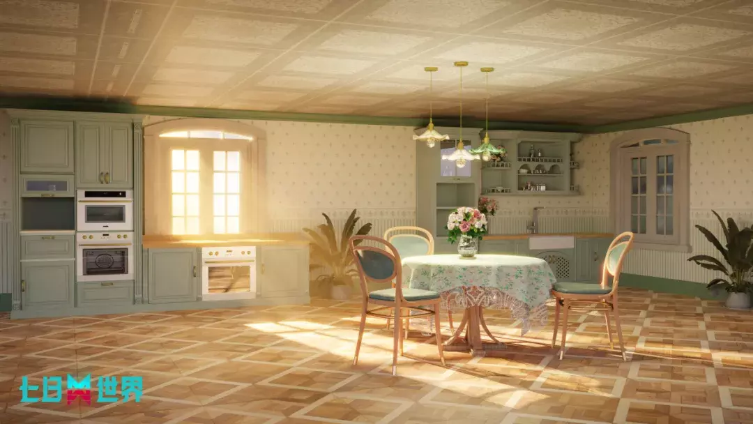 阳光透过窗,给复古厨房镀上暖金,橱柜与壁纸晕染出温柔旧时光。圆桌铺着碎花布,繁花尽情绽放。倒一杯琥珀红茶,烤一个甜蜜的苹果派,这一方小天地,藏着生活最熨帖的模样。