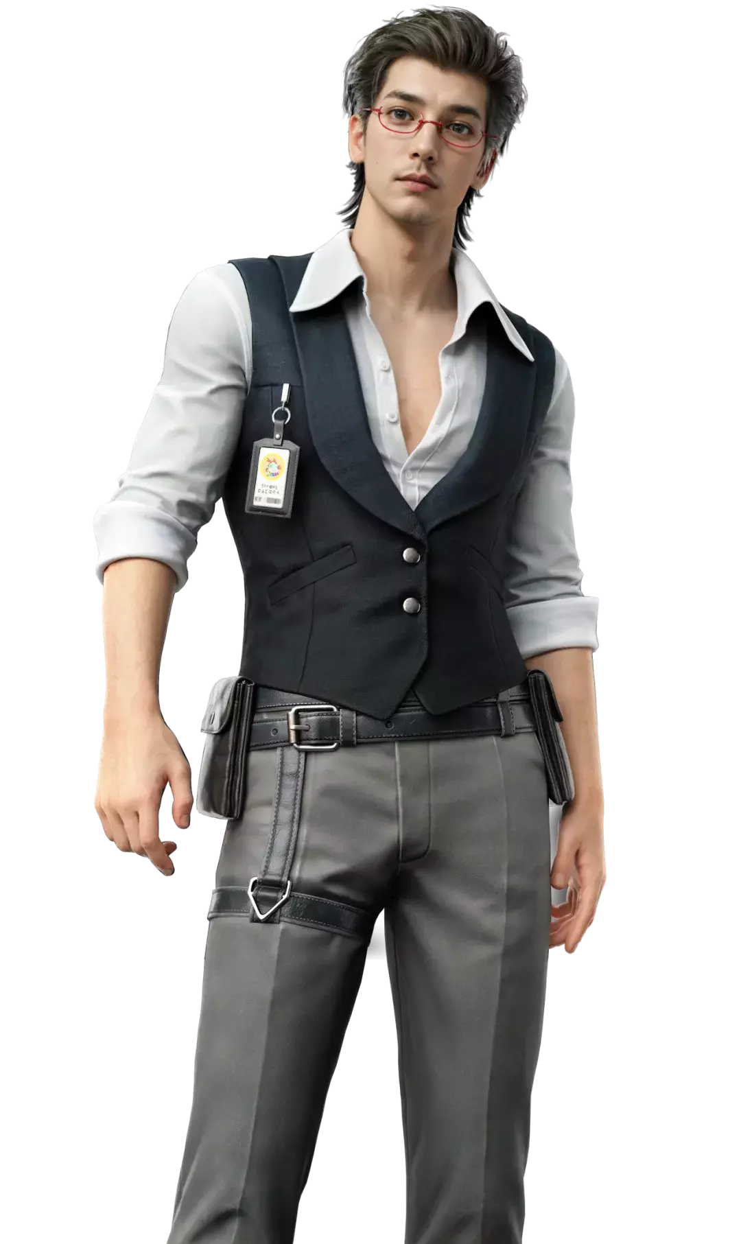 领口微敞、马甲紧扣、装束利落游刃有余。