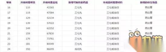 炼药16-24级花费: