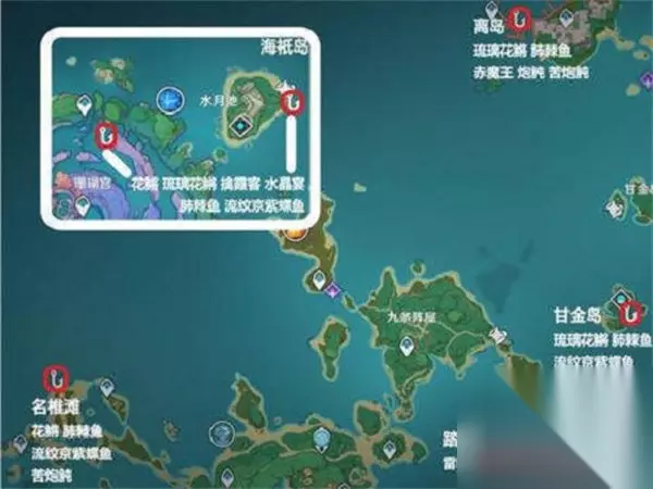 Hello,各位小伙伴,大家好!今天给大家带来稻妻全钓鱼点位。部分路线比较难走有视频。以下红色字体为兑换鱼叉所需要的鱼类。钓鱼点位共计13处,下面我们直接进入正题。(部分鱼类只在白天或晚上出没) 离岛钓鱼点位:琉璃花鳉、肺棘鱼、赤魔王、炮鲀、苦炮鲀