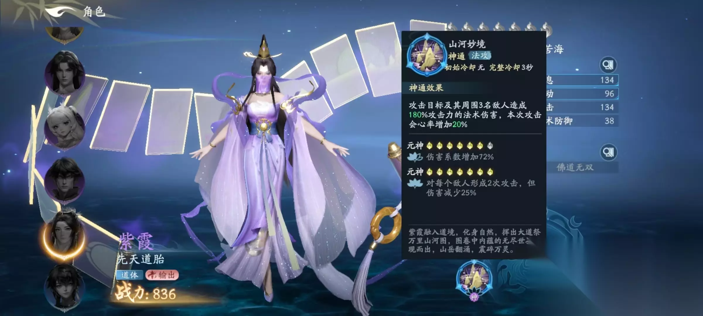 紫霞是属于先天道胎,自身作为输出,在技能方面还是比较犀利的。第1个技能是神通山河妙境,属于法攻类型,效果是攻击目标以及周围的三名敌人,可造成法术伤害,在本次攻击时会心率额外提升。提升元神等级之后,该技能的伤害系数增加,对每个敌人都能够形成两次攻击,虽然单次伤害减少,但总伤害量依然有着很明显的提升。