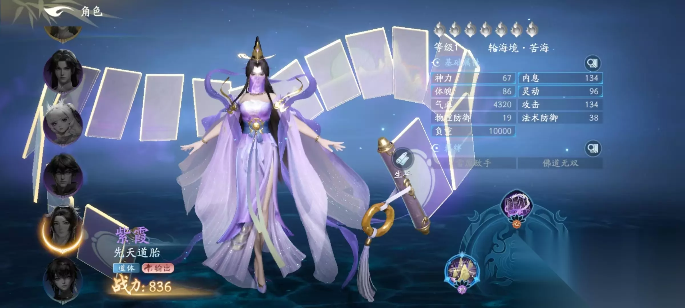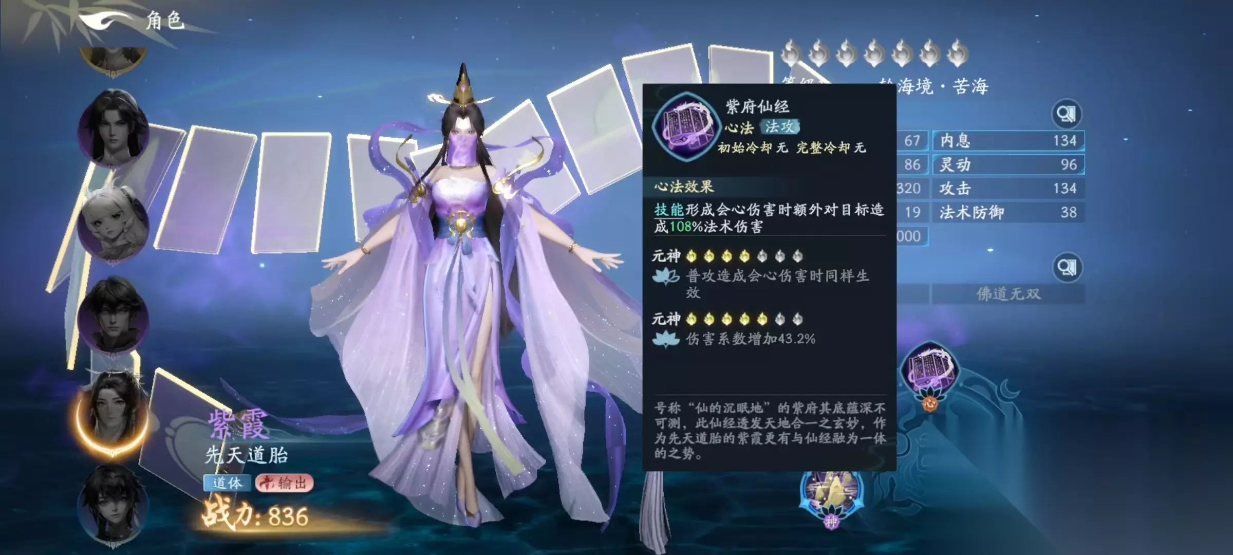 第2个技能是紫府仙经,属于法攻类型,在技能形成会心伤害时,可额外对目标造成一次法术伤害。提升元神等级之后,即使是普攻,造成的会心伤害同样会生效,也就意味着触发会心之后,除了会心的额外伤害之外,还能再输出一次,所以是一个很依赖于彗会心的角色。第3个紫气东来,也是属于法攻类型,对竖列敌人造成法术伤害,提升元神等级之后,本次攻击会心率有额外加成,伤害系数也有额外加成。