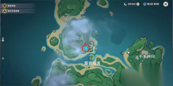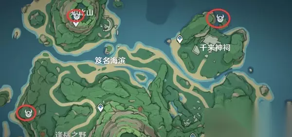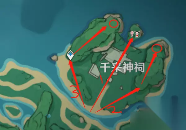 1、供奉栖木三个位置分别在 千来神 祠、知比山、逢岳之野,具体位置如下图;